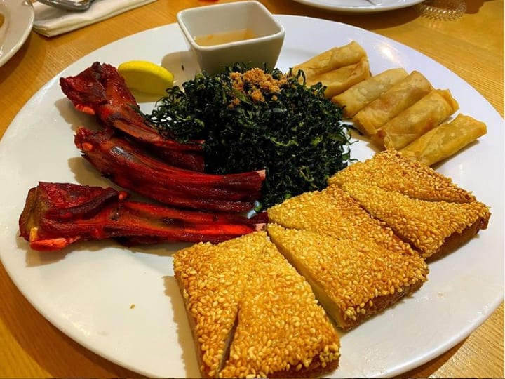 1 vegetable spring roll, 1 steamed dumpling, 1 chicken satay & 1 prawn toast. Served with sweet chilli sauce & satay sauce