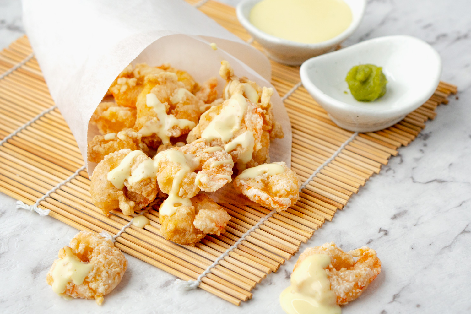 Panko breaded King Prawns, deep fried & served with a spicy Wasabi mayo.